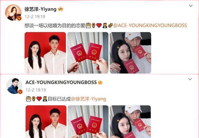 12月2日,两人再次同时晒出结婚证,进度神速,堪称娱乐圈情侣楷模。